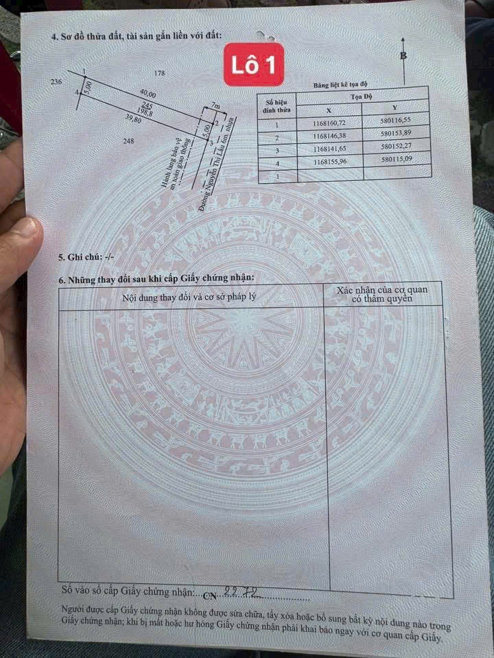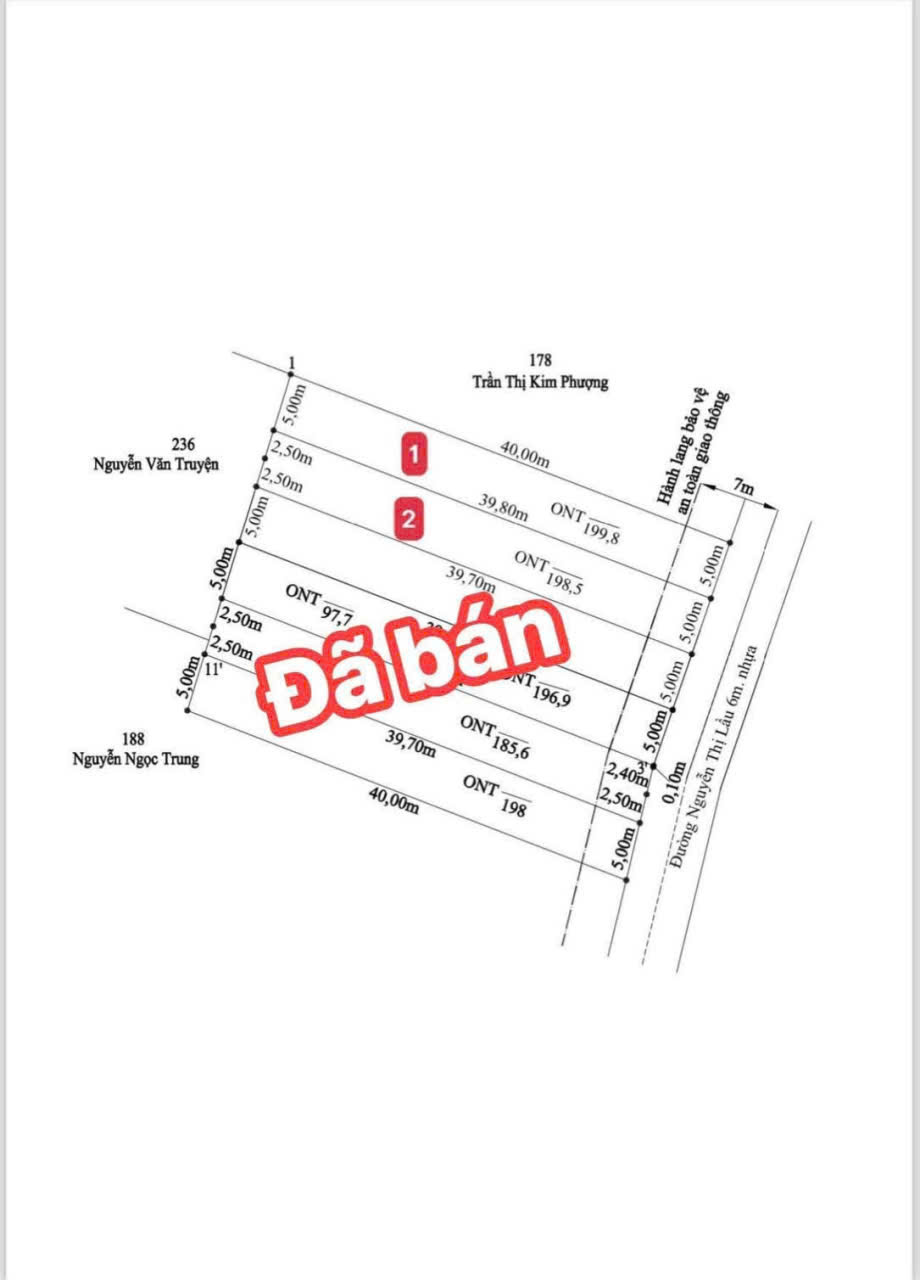 - Diện tích : 5 x 40 ( 199m2 ) full thổ cư , đã san lấp bằng phẳng
