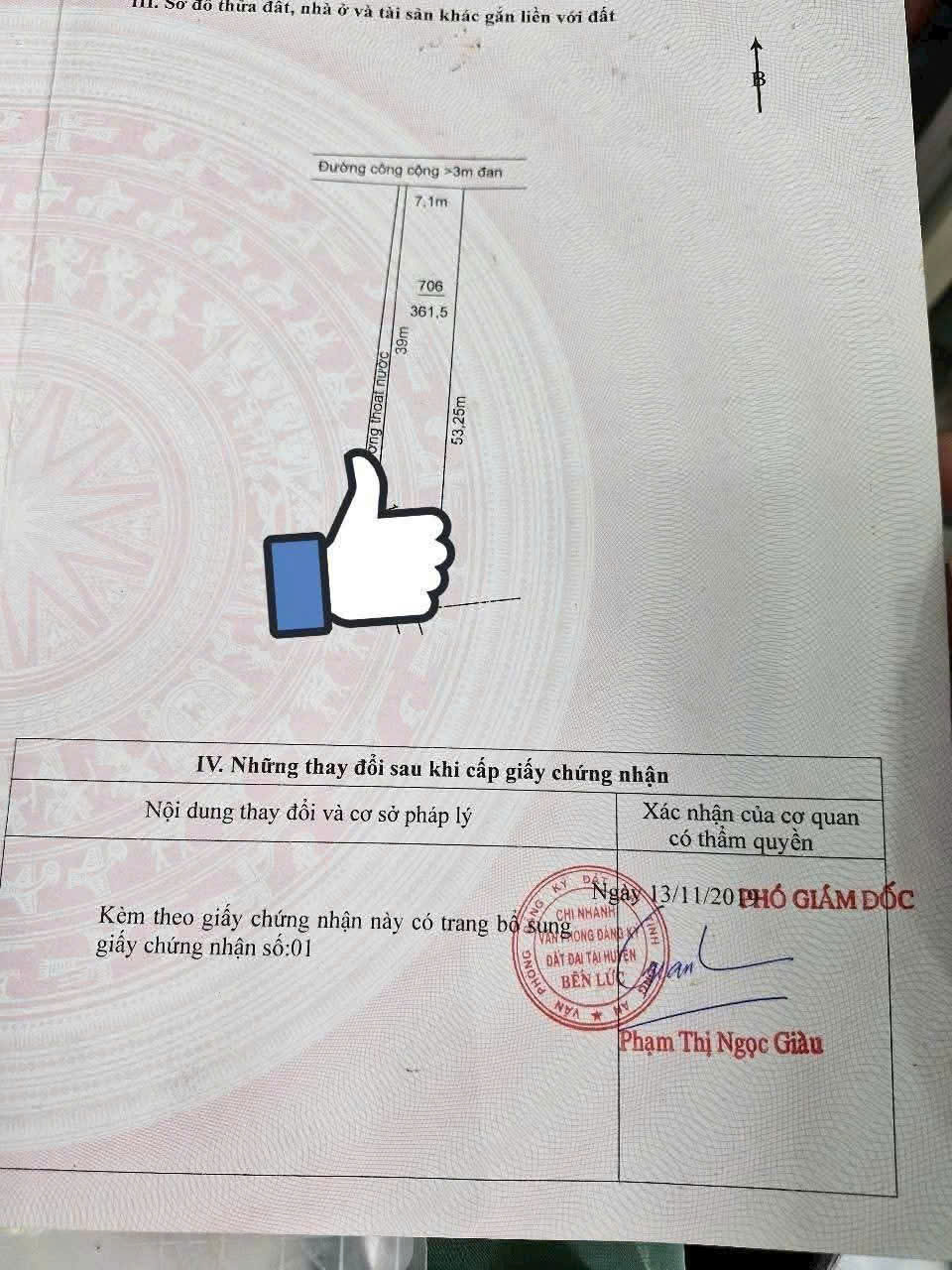 Ngang 7,1m dài 39. Cạnh dài 53m. Tổng DT 361,5 m² full thổ cư